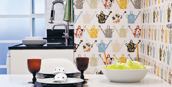 - Cozinhas – Para cozinhar os papeis de paredes recomendados são os lisos, os com estampas geométricas e os com motivos relacionados ao mundo da culinária. Os papeis de paredes para cozinha precisam ser em vinil porque possuem uma maior resistência e são fáceis de limpar.