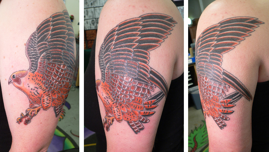 O falcão é uma ave muito bonita e misteriosa que pode ser vista em montanhas e outros locais de difícil acesso. Essa ave é muito pedida por pessoas que resolvem fazer uma tatuagem. Geralmente os homens são os que mais fazem tatuagens de falcão, porém é possível encontrar mulheres que adotaram esse desenho.