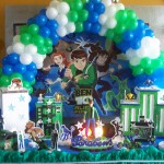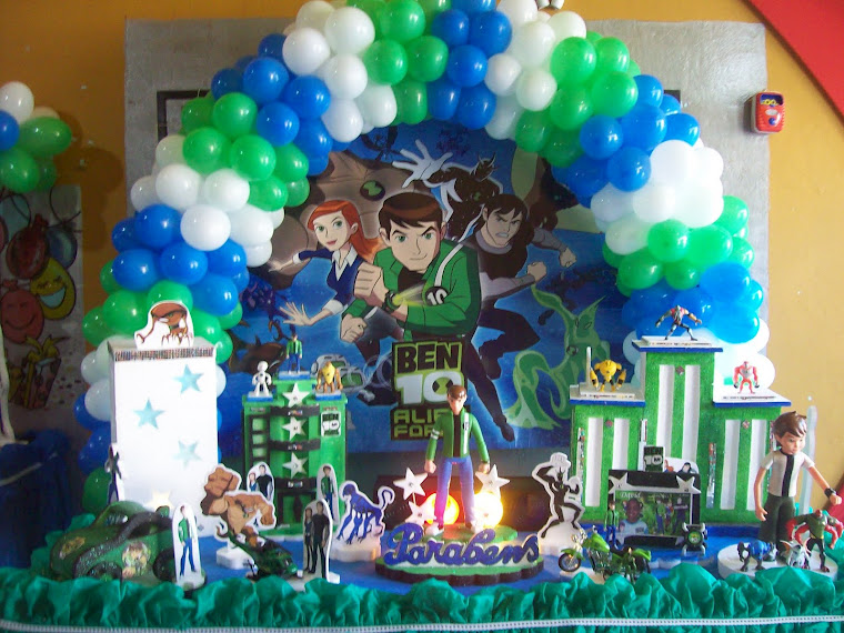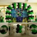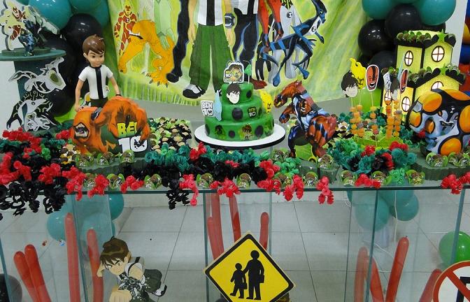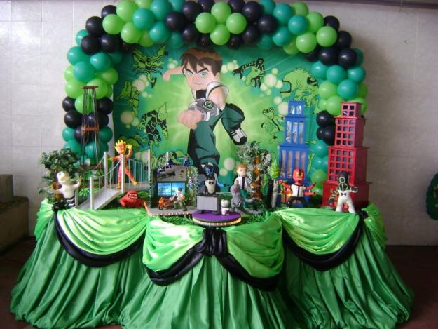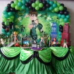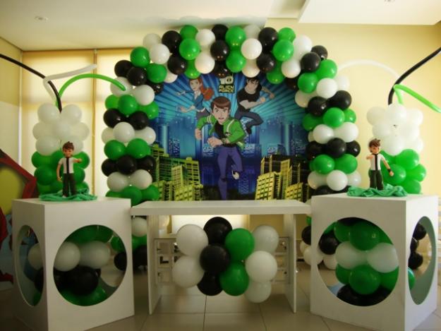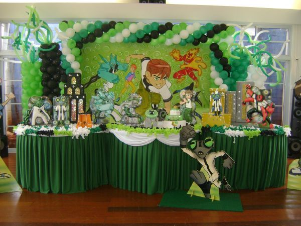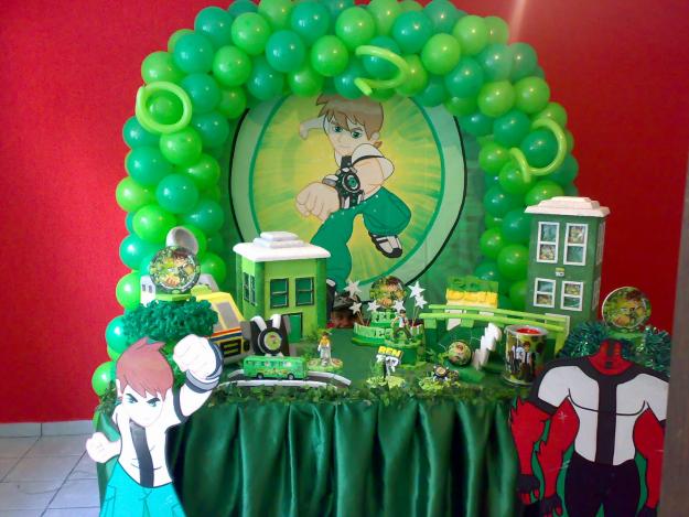 A decoração de festa infantil Ben 10 pode ser feita de diferentes formas, sendo que ela traz as cores do desenho que são: verde, branco e preto. Para fazer essa decoração basta pegar um grande pôster do desenho, colá-lo em um arco feito com bexigas das cores do desenho. Já a mesa pode ser coberta por uma toalha verde ou branca e sobre ela devem ser colocados as lembrancinhas do Ben 10, os doces, salgados e o bolo personalizado com as cores e um bonequinho do Ben 10.