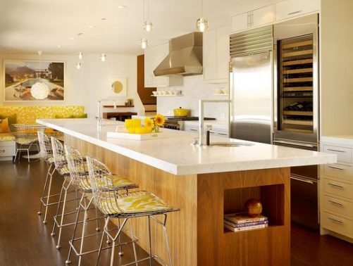 O balcão que divide a sala e a cozinha pode ser confeccionado em mármore, granito, madeira e outros materiais e eles podem ser pequenos ficando apenas na frente da cozinha ou grandes que rodeiam a cozinha quase que completamente, tudo vai depender do gosto do dono da casa.