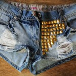 14. 6 – Para completar falta aplicar as tachinhas, para isso, escolha o lugar que vai colocá-las, pegue a tachinha, fixe os dentes da tacha no lugar e aperte até que saiam do outro lado, depois amasse-os bem com o alicate, coloque as demais tachas e costure um tecido no verso do short para que as tachas não incomodem.