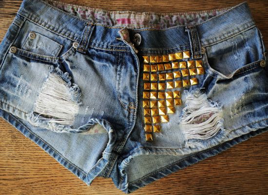 14. 6 – Para completar falta aplicar as tachinhas, para isso, escolha o lugar que vai colocá-las, pegue a tachinha, fixe os dentes da tacha no lugar e aperte até que saiam do outro lado, depois amasse-os bem com o alicate, coloque as demais tachas e costure um tecido no verso do short para que as tachas não incomodem.