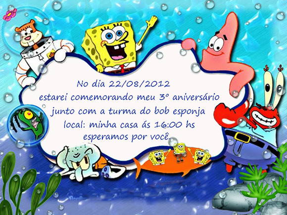 Para organizar uma super festa de aniversário infantil do Bob Esponja é preciso também ficar atenta a escolha do bolo e convites, pois são muitos os modelos disponíveis, sendo que os bolos que mais fazem sucesso são os no formato do Bob e os redondos com dois ou mais andares decorados com as cores e desenhos do personagem, já os convites tem para todos os gostos destacando os personalizados que trazem o Bob e o nome ou até mesmo a foto do aniversariante, além de indicar o local e horário da festa.