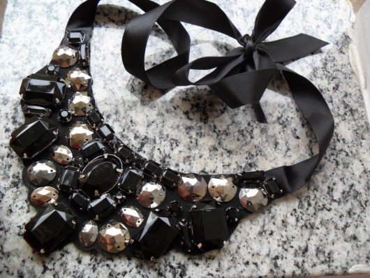 6° Corte a fita de cetim ao meio, coloque cola nas extremidades do colar e fixe as fitas, pode também fazer um acabamento colando um pedaço de napa para cobrir as pontas da fita, espere um dia para que ele seque completamente e fique com as pedras bem fixadas.