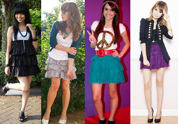 As saias em camadas estão super na moda e são mais usadas pelas jovens que não abrem mão de um visual moderno e descontraído, elas são bem diversificadas contando com várias modelos onde não faltam as curtas, médias, soltas, justas, que trazem detalhes como zíperes, botões, laços e rendas, e com cores para todos os gostos, onde encontramos as com tons diferentes de: rosa, preto, azul, vermelho, verde, cinza, roxo e outras, além das estampadas que são delicadas e que contam com listras, poás e estampas florais e de outros desenhos.