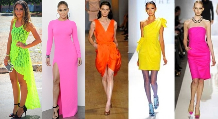 Os vestidos neon moda 2013 trazem modelos variados onde o destaque fica por conta dos: curtinho e médios, dos tomara que caia, de alças, ombro só e com mangas compridas, dos com cintura marcada, saia rodada, com decotes e fendas, além dos soltinhos e dos com leves transparências, entre outros, sendo que as cores mais vistas são: rosa, amarelo, laranja e azul.